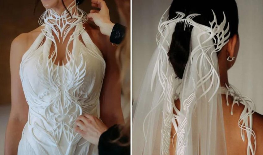 Designer Iris Van Herpen has unveiled a 3D printed wedding dress. This unique dress features a futuristic, intricate design and was tailored to fit the future bride's body precisely using a 3D body scan. The creation process included extensive design work over 600 hours and a 41-hour print time. The dress combines traditional couture techniques with advanced materials like Nylon (PA12), ensuring durability and flexibility. This marks a significant development in using 3D printing technology in high fashion.